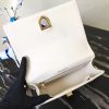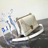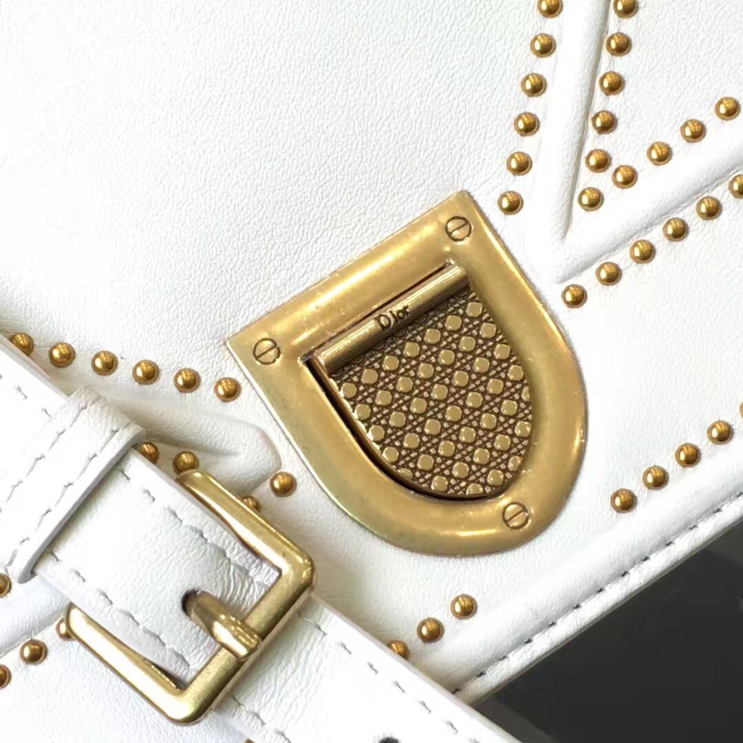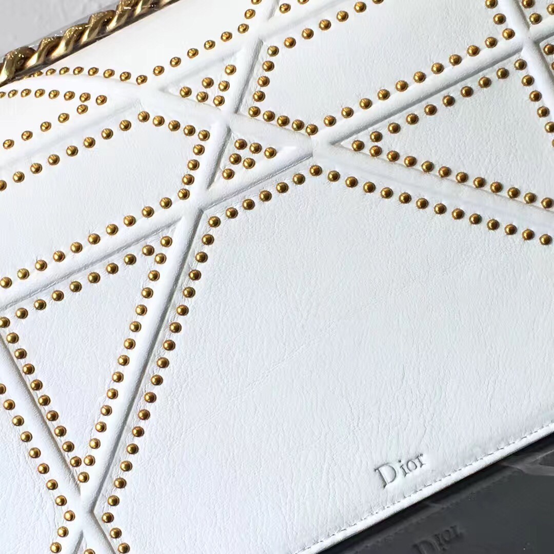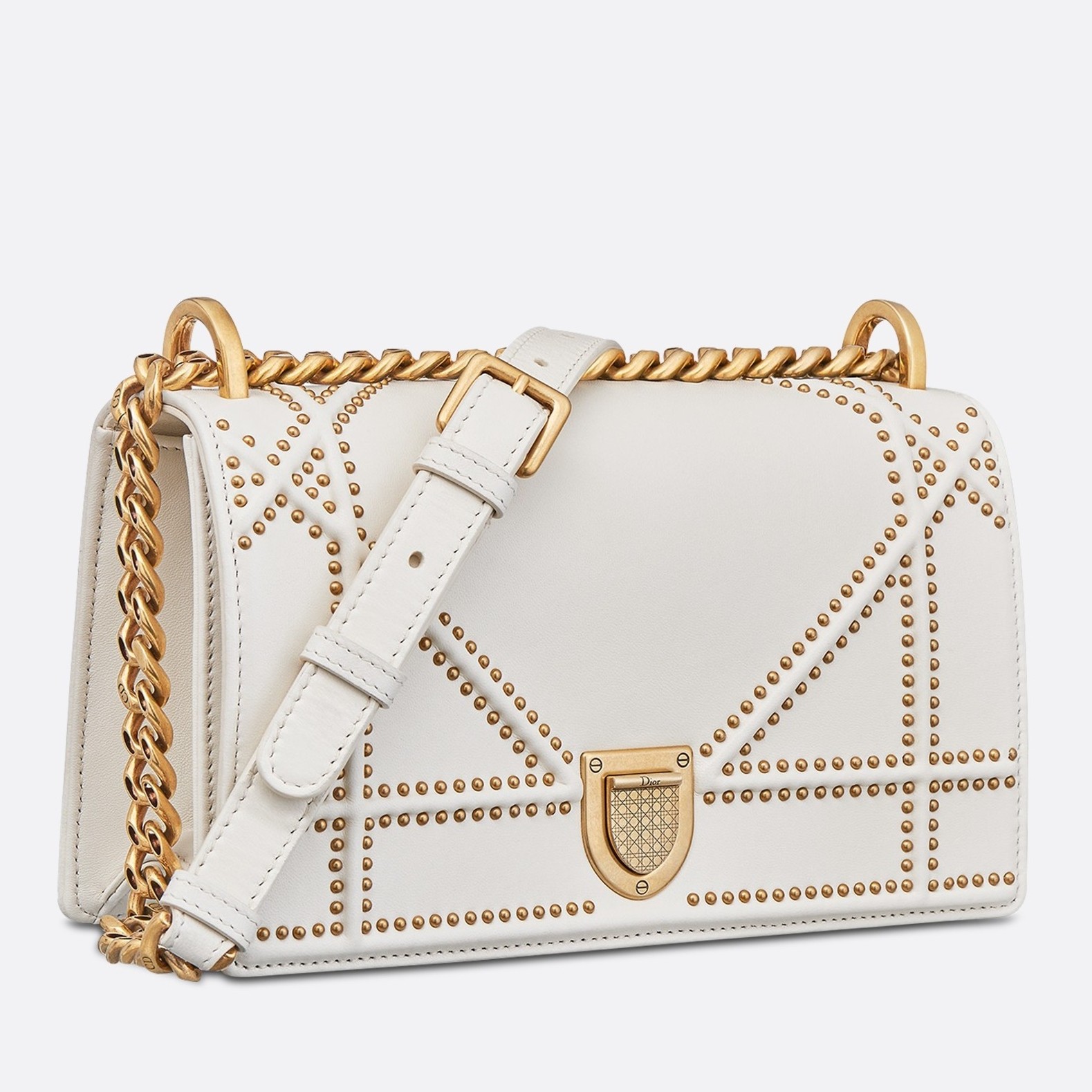 Finest lambskin leather and “archicannage” topstitching combine with metal studs accents to create this Diorama flap bag. All while remaining faithful to the structural style of the original bag’s shape, it retains its antique gold crest-shaped closure and chain strap. Wear over the shoulder or as a crossbody.