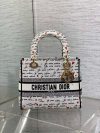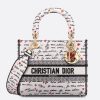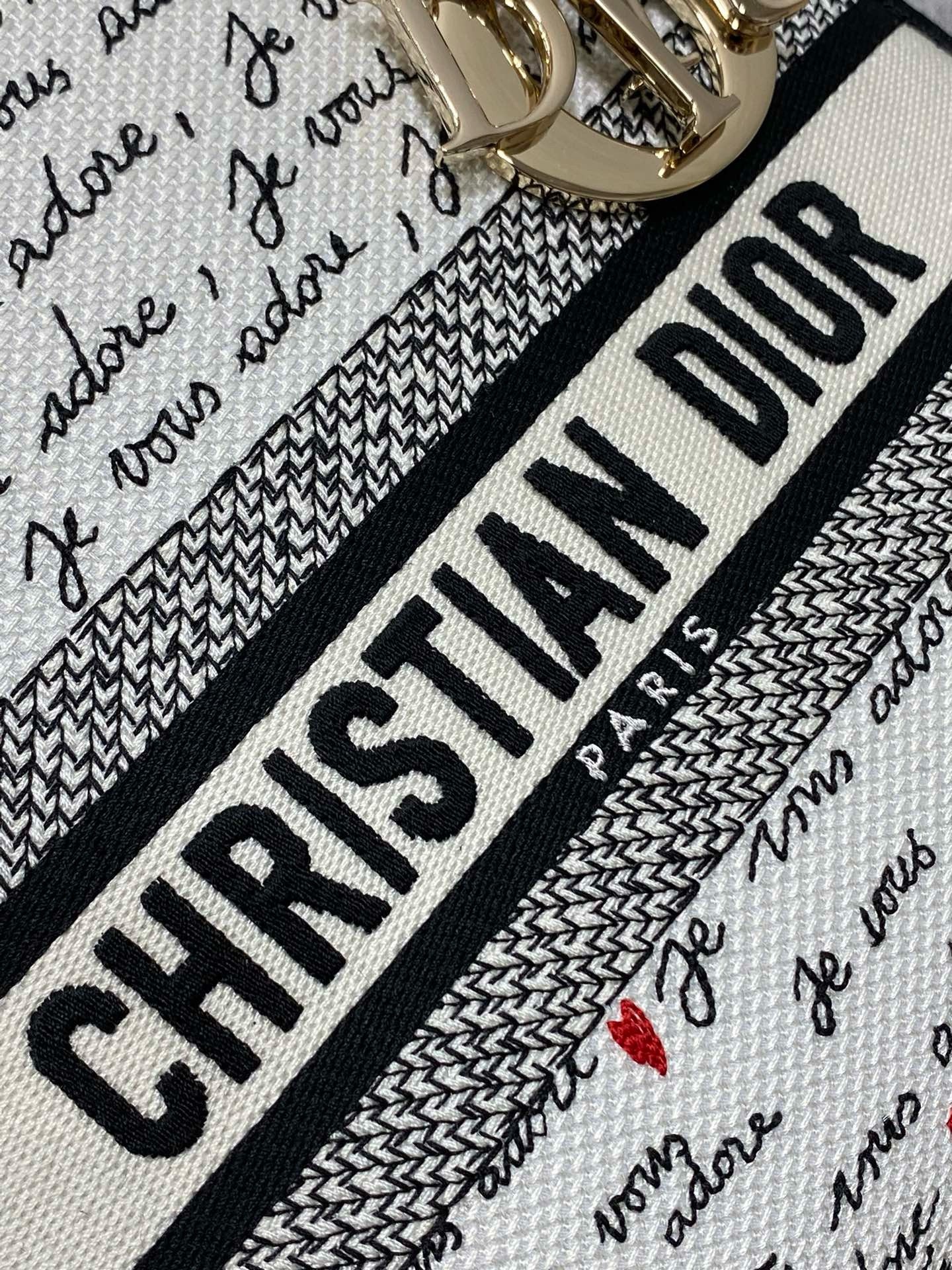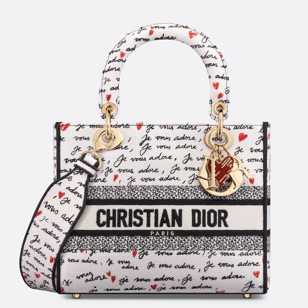 Part of the Dioramour capsule, the Lady D-Lite bag combines classic elegance with House modernity. The white style is fully embroidered with the black and red Je Vous Adore (I Love You) motif, inspired by the Marc Bohan for Dior archives. The front features a Christian Dior Paris signature while the pale gold-finish metal D.I.O.R. charms are complemented by a red enamel heart charm. Equipped with a wide, reversible and removable embroidered strap, the medium Lady D-Lite bag can be carried by hand or worn crossbody, and it will coordinate well with other Dioramour creations.