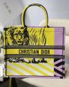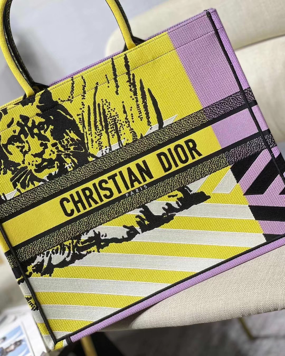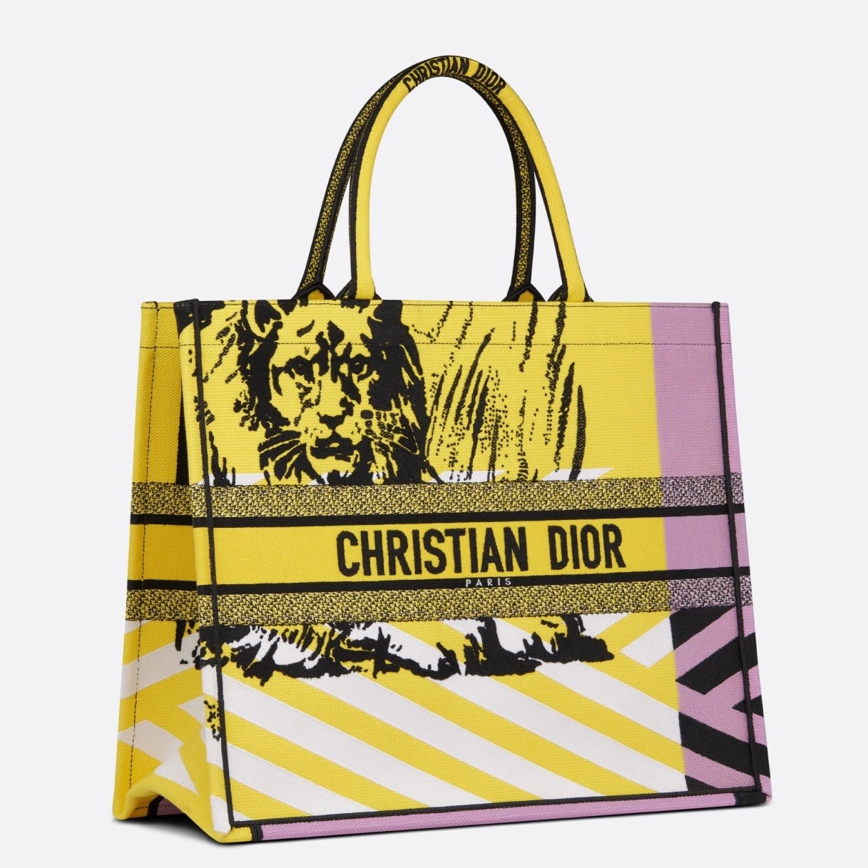 Introduced by Maria Grazia Chiuri, Creative Director of Christian Dior, the Dior Book Tote has become a staple of the Dior aesthetic. Designed to hold all the daily essentials, the style is fully embroidered with the bright yellow and pink D-Jungle Pop motif, inspired by the House archives and echoing the collection’s colorful pop universe. The design is adorned with the ‘CHRISTIAN DIOR PARIS’ signature on the front and exemplifies the House’s signature savoir-faire. The large tote may be carried by hand or worn over the shoulder.