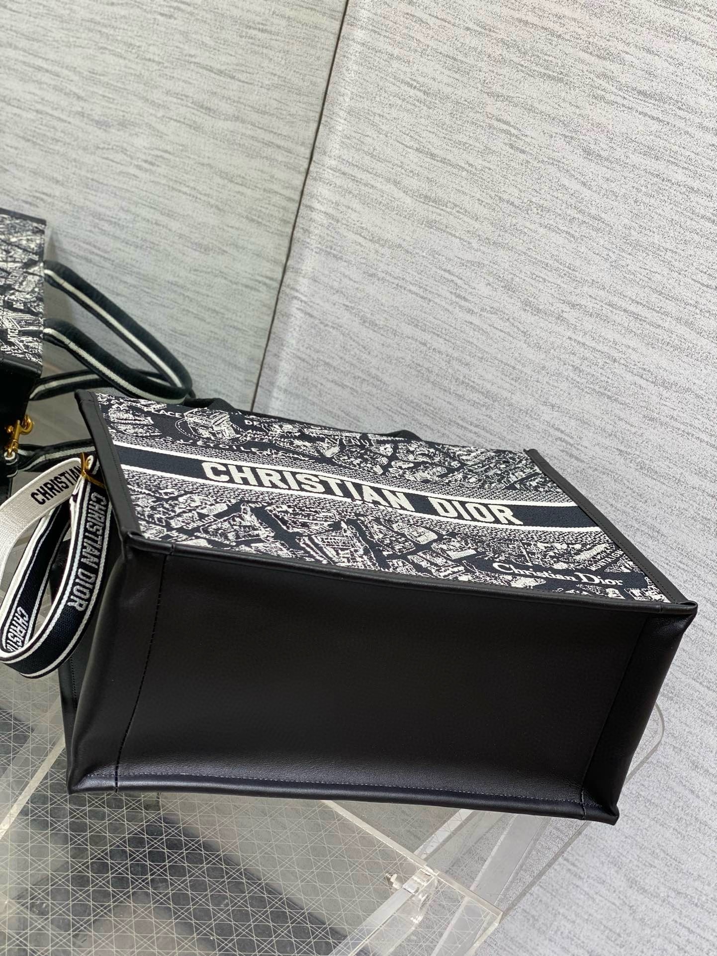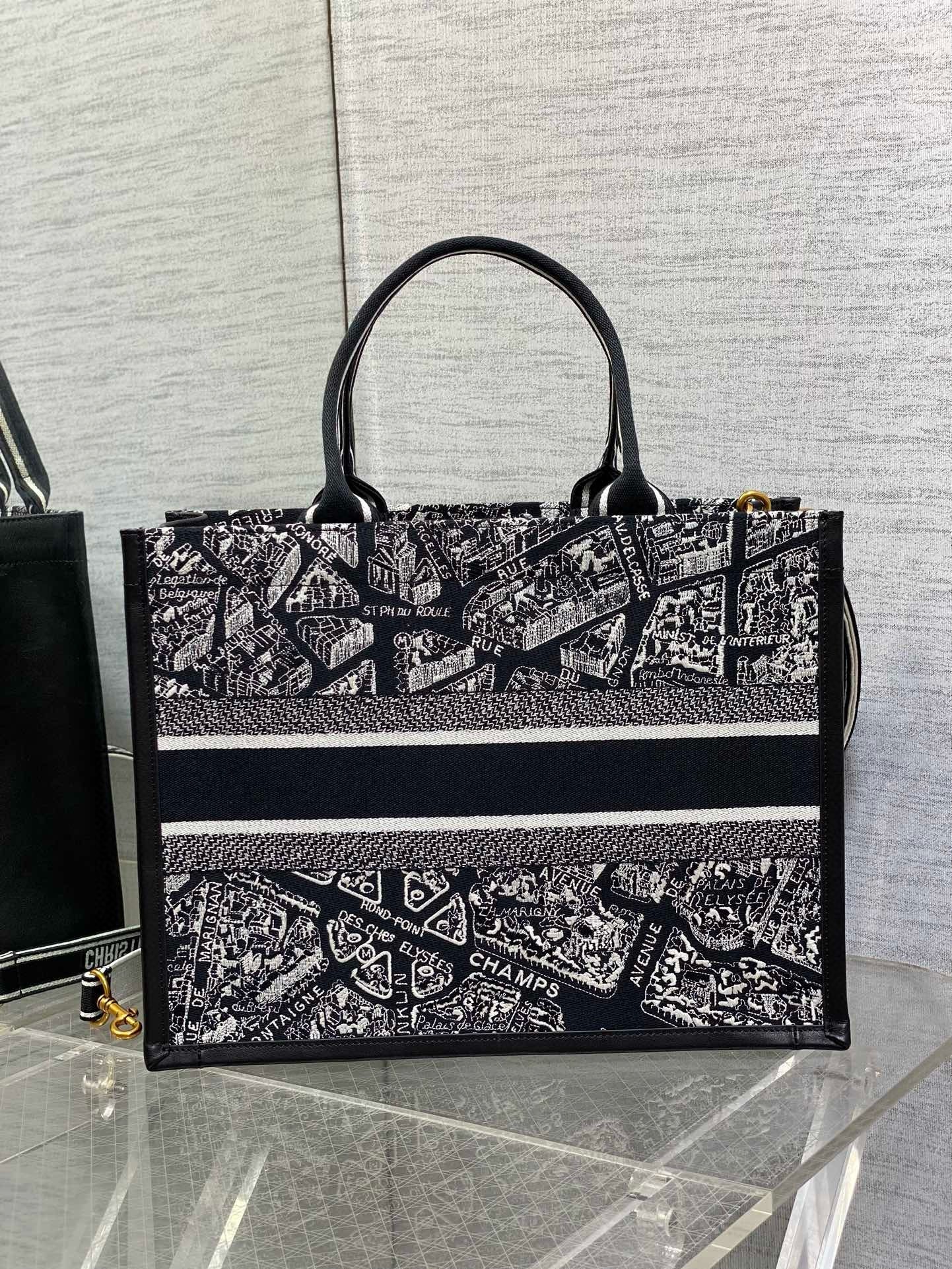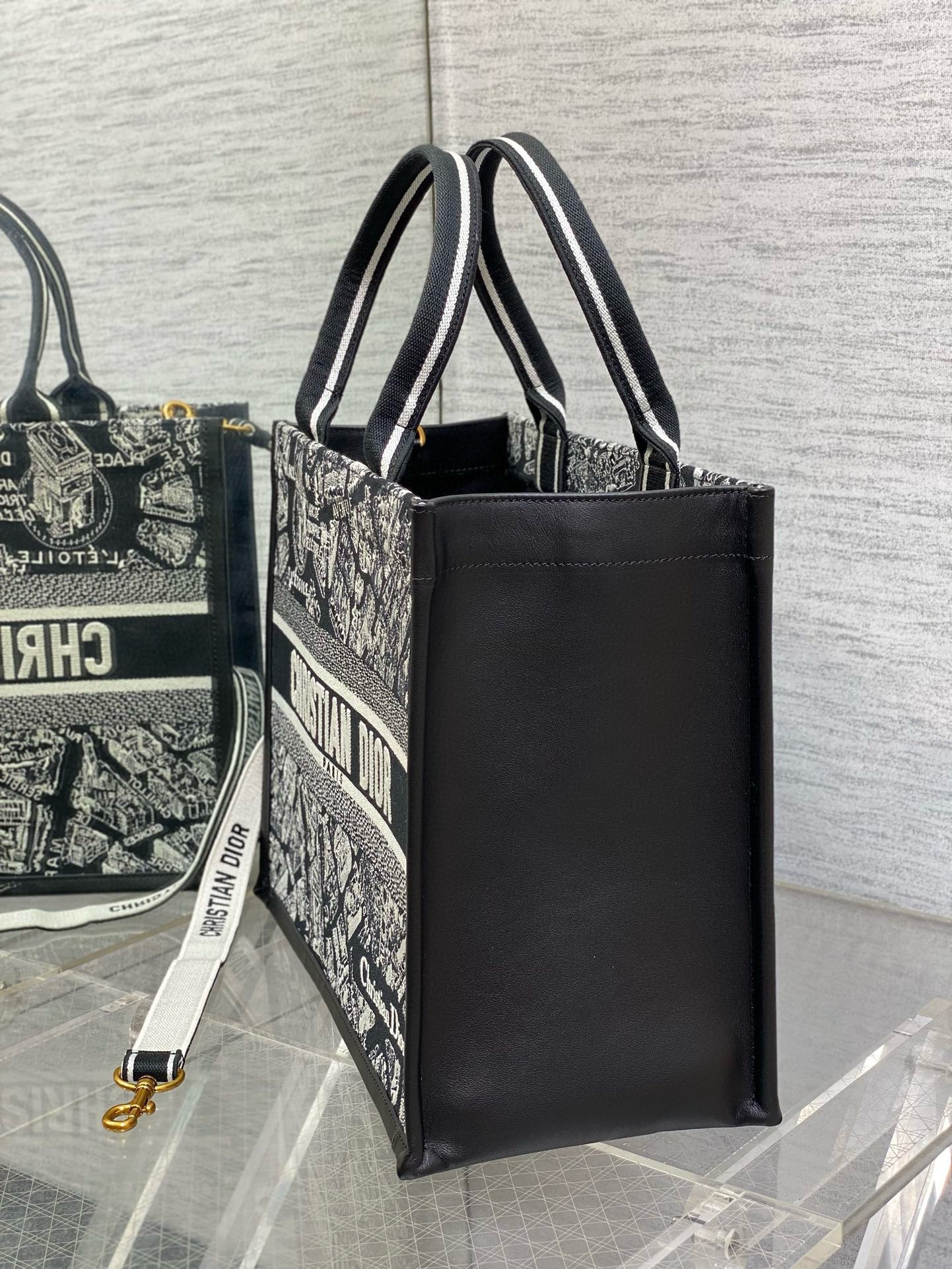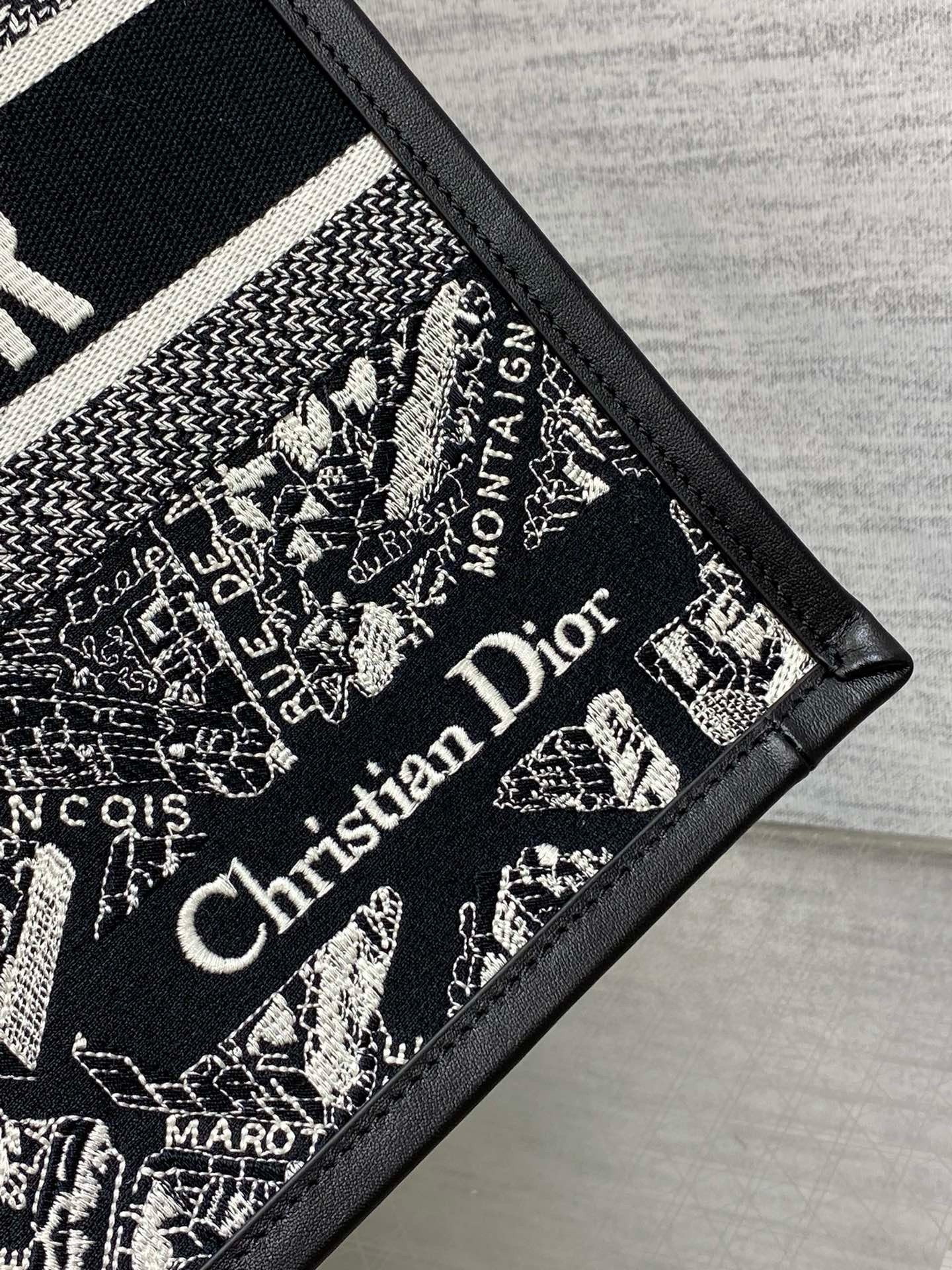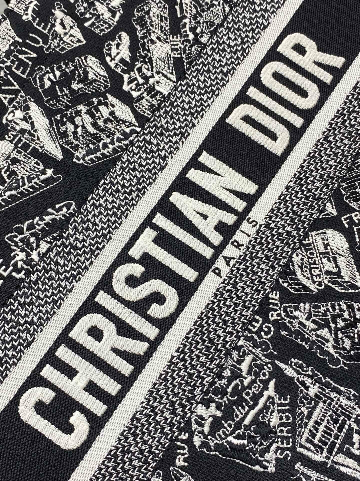 Maria Grazia Chiuri’s hallmark Dior Book Tote is presented in an elegant new variation. The refined style showcases the white and black Plan de Paris embroidery and black calfskin. The motif is inspired by House archives and structured around Dior’s historic Avenue Montaigne address. Designed to keep all the daily essentials organized, the interior is equipped with a zip pocket and slip pockets. Featuring an adjustable and removable shoulder strap, the practical medium tote exemplifies Dior’s savoir-faire and can be carried by hand or worn over the shoulder.