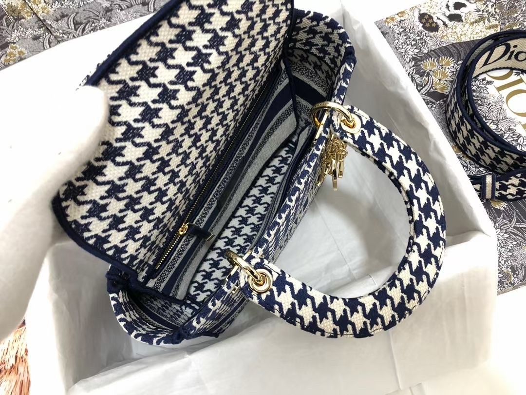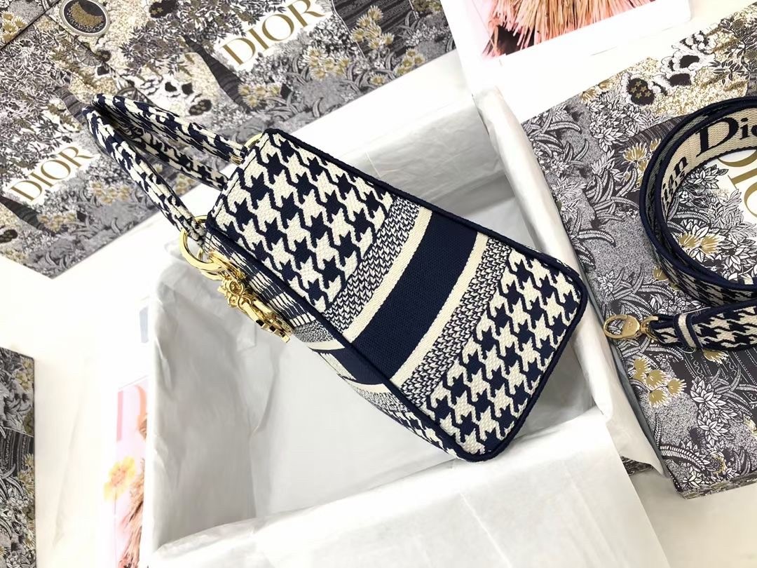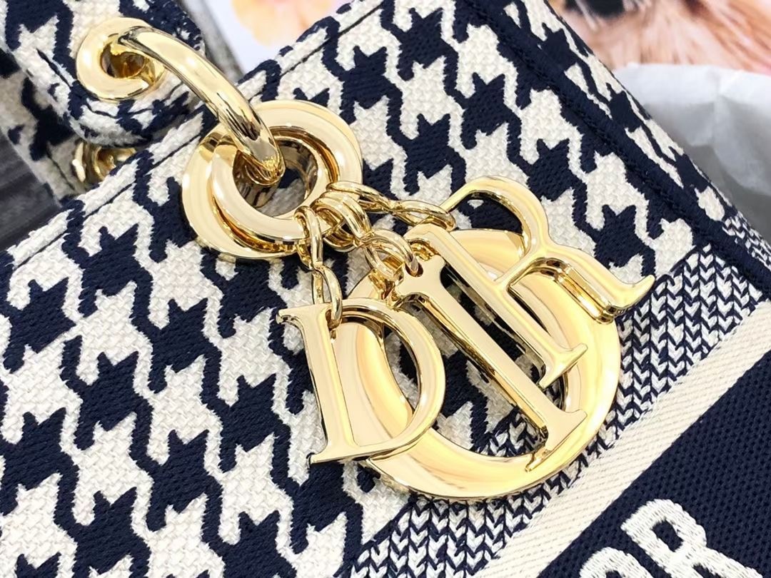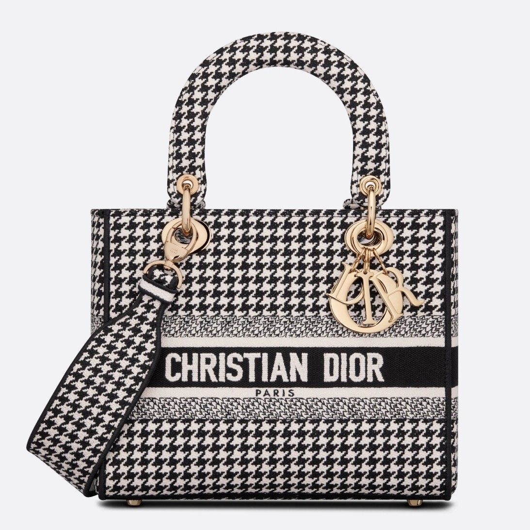 The Lady D-Lite bag combines classic elegance with House modernity. The style is fully embroidered with the black and white houndstooth motif, a play on the hallmark House pattern. The front features a ‘CHRISTIAN DIOR’ signature while the thick ‘D.I.O.R.’ charms in pale gold-finish metal embellish and illuminate the silhouette. Equipped with a wide, reversible and removable embroidered shoulder strap, the medium Lady D-Lite bag can be carried by hand, worn over the shoulder or crossbody.
