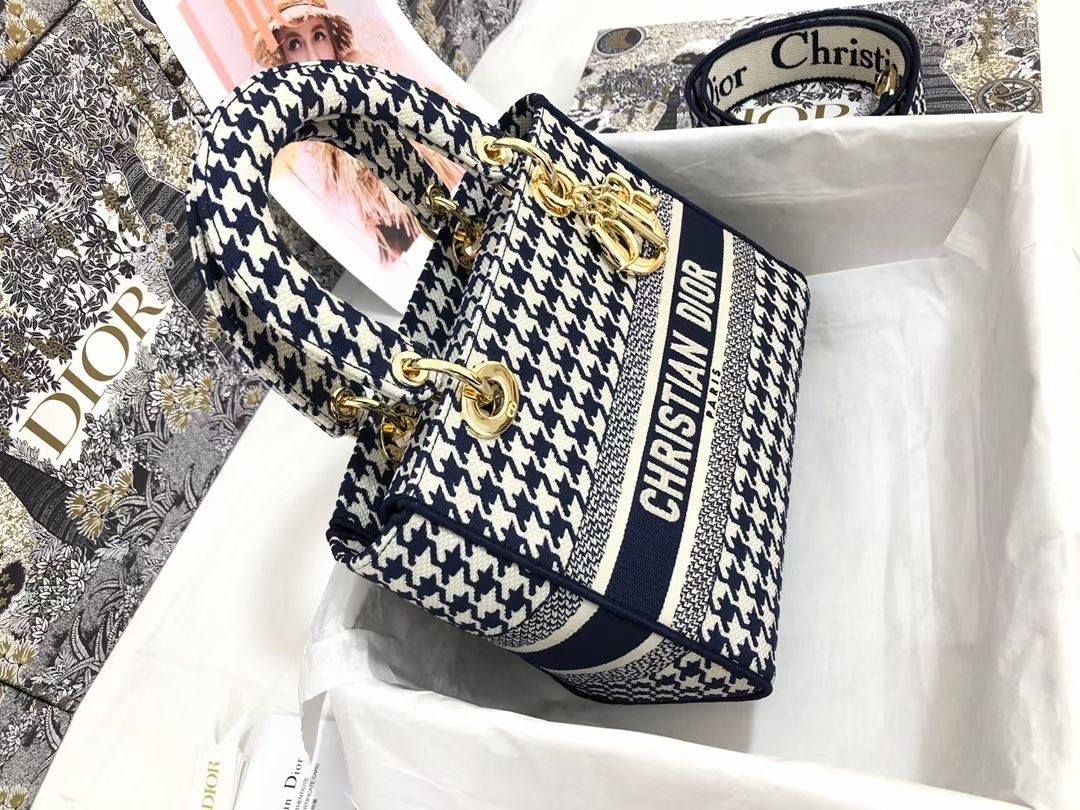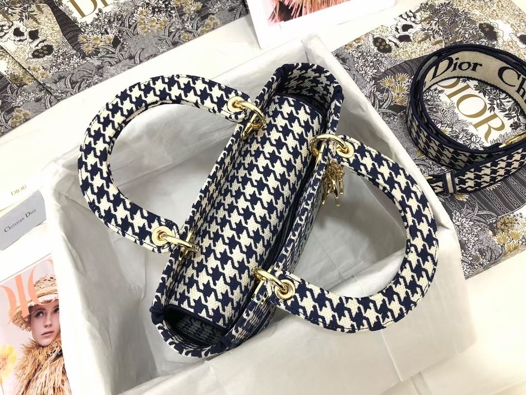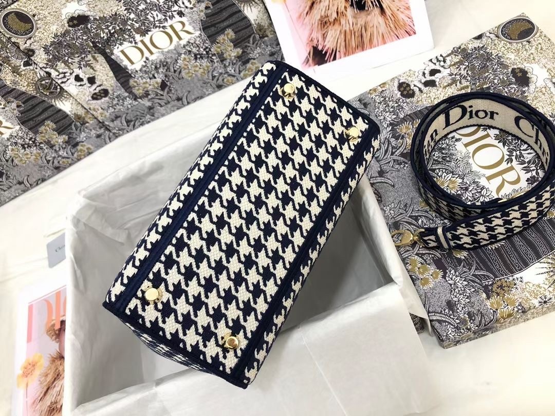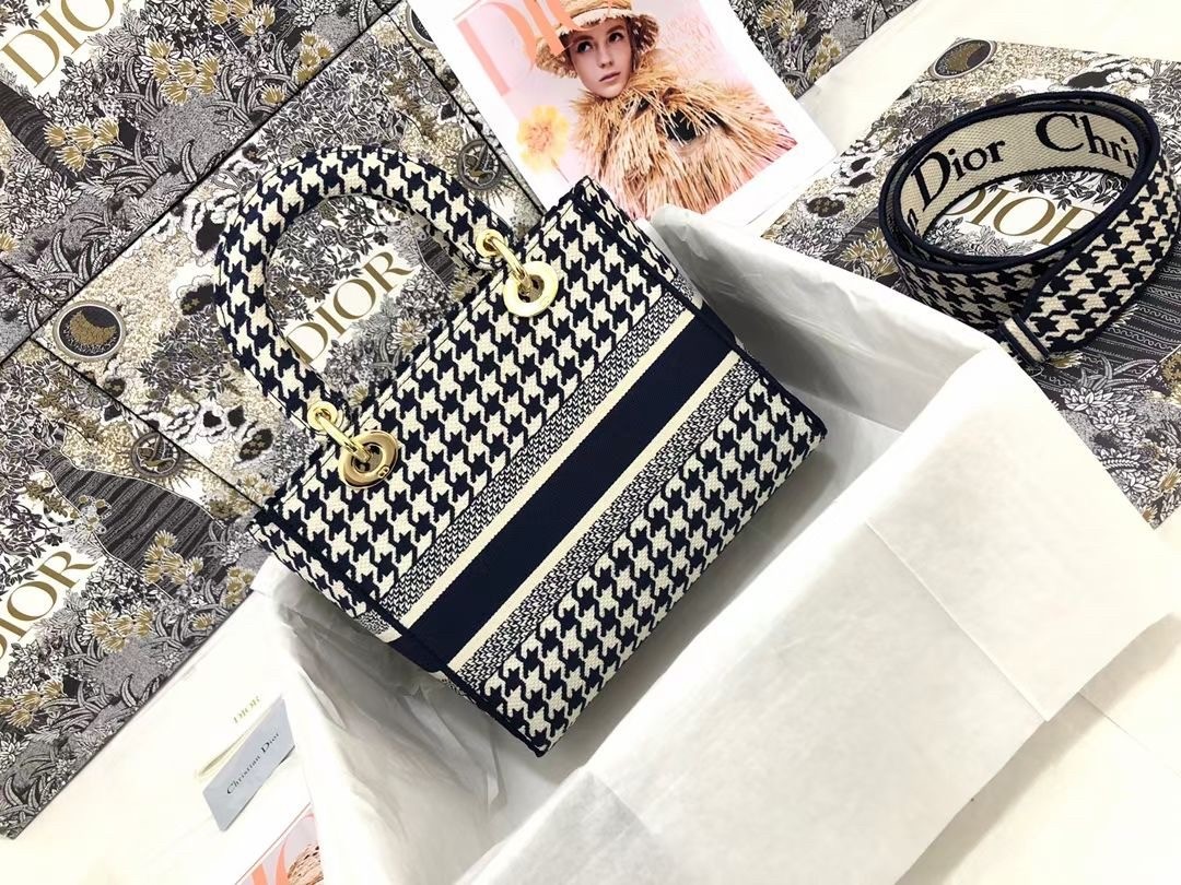 The Lady D-Lite bag combines classic elegance with House modernity. The style is fully embroidered with the black and white houndstooth motif, a play on the hallmark House pattern. The front features a ‘CHRISTIAN DIOR’ signature while the thick ‘D.I.O.R.’ charms in pale gold-finish metal embellish and illuminate the silhouette. Equipped with a wide, reversible and removable embroidered shoulder strap, the medium Lady D-Lite bag can be carried by hand, worn over the shoulder or crossbody.