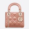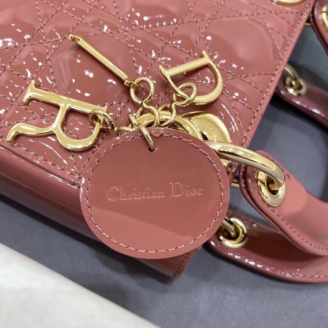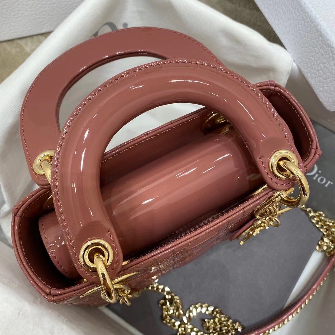The Lady Dior bag embodies the House’s vision of elegance and beauty. Sleek and refined, the style is timeless. It is crafted in patent calfskin with Cannage stitching, creating the instantly recognizable quilted texture, while the pale gold-finish metal ‘D.I.O.R.’ charms further embellish its silhouette. Featuring a removable chain shoulder strap, the miniature Lady Dior bag can be carried by hand or crossbody as an ideal evening wear companion.