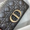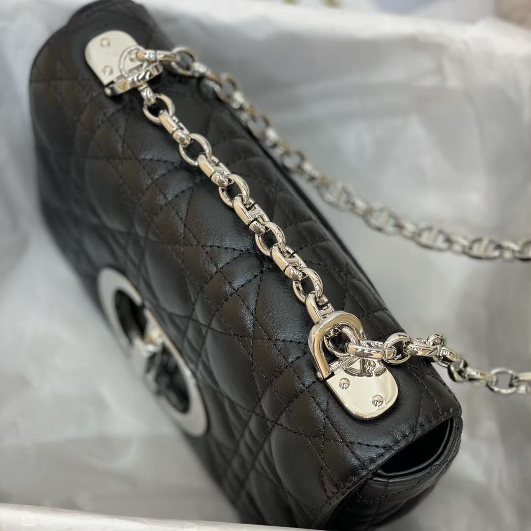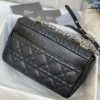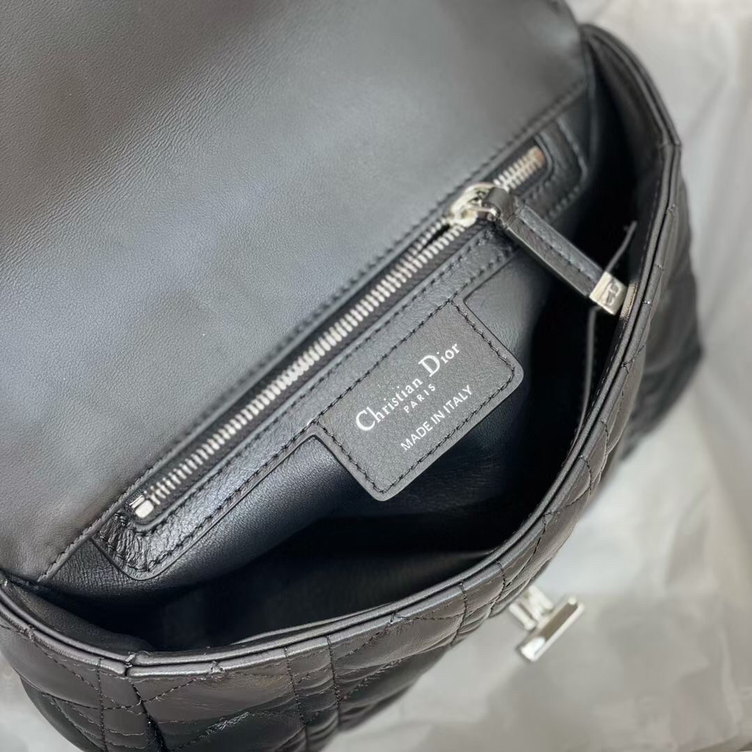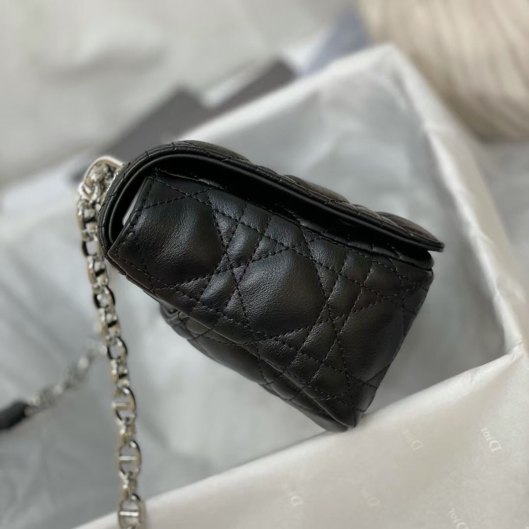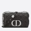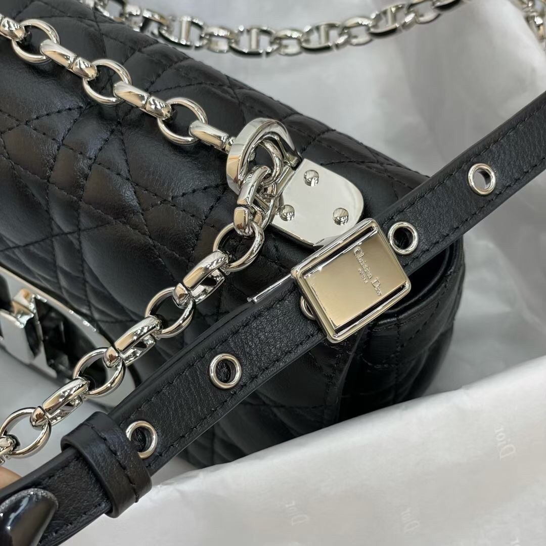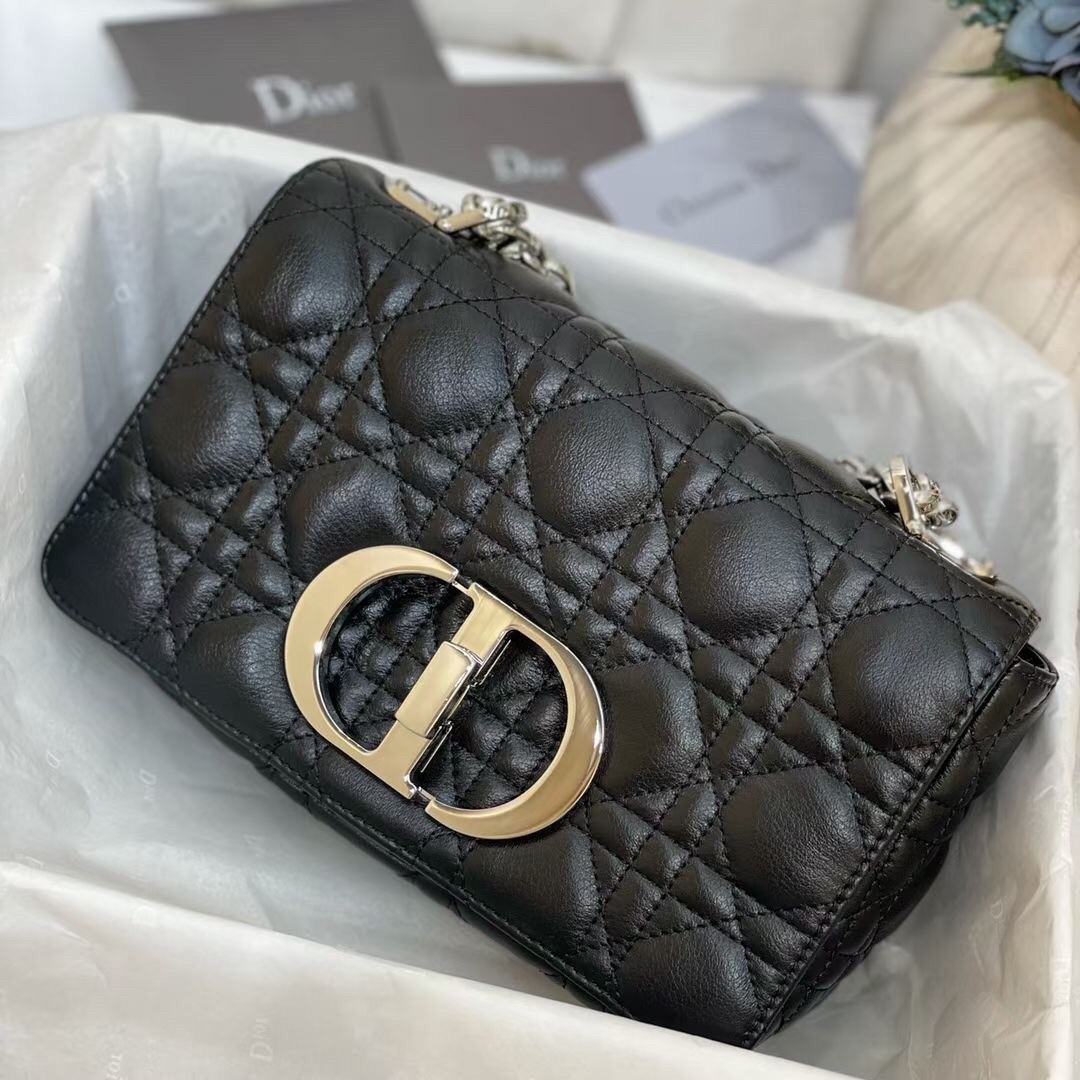 The new Dior Caro bag, in black supple calfskin, is adorned with the instantly recognizable Cannage stitching. The supple bag features a flap with an antique silver-finish metal twist ‘CD’ clasp, inspired by the seal of a Christian Dior perfume bottle. The removable signature ‘CD’ chain link shoulder strap can be replaced with a wide embroidered strap, allowing the small style to be worn during both the day and the evening for a modern, elegant look.