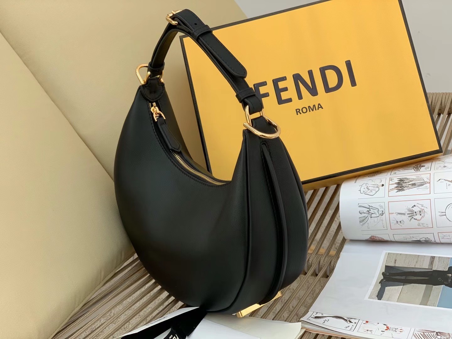 Revealed on brand’s Spring/Summer 2022 runway, the Fendigraphy Bag is Fendi’s take on the timeless hobo silhouette and the fashion crowd is already obsessed! Defined by a crescent shape with a spacious carry-all design, the Fendigraphy bag is a modern and bold icon ?C the new must-have for the powerful and confident Fendi woman. Once worn, the bag will stun with its maxi Fendi golden metal script, leaving the iconicity of the Maison’s logo on display for everyone to see. Wearability being so dear to Fendi, the bag fits perfectly under the arm thanks to its circular armhole. Its removable and adjustable strap allows you to transform it into a soft and supple satchel bag with a functional crossbody attitude if paired with a Strap You.