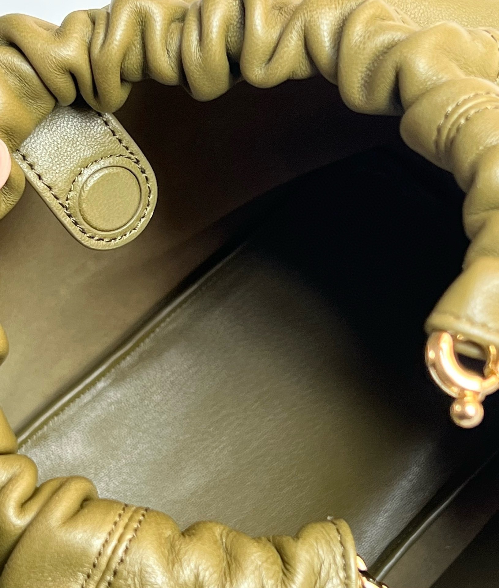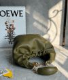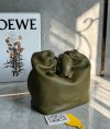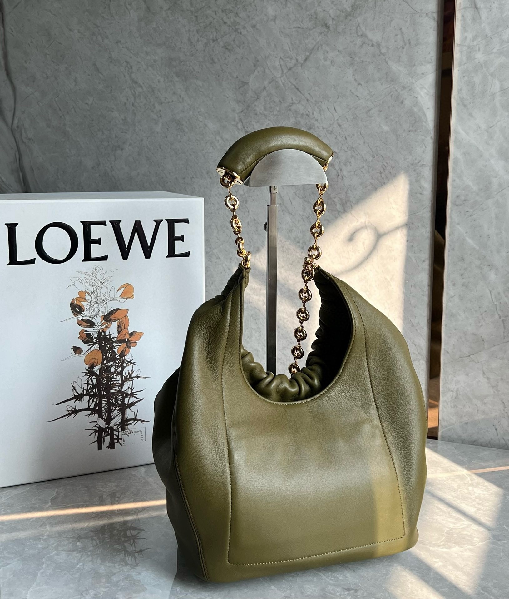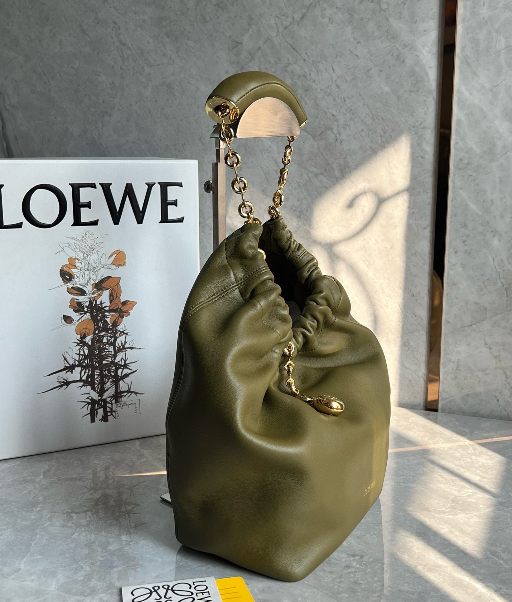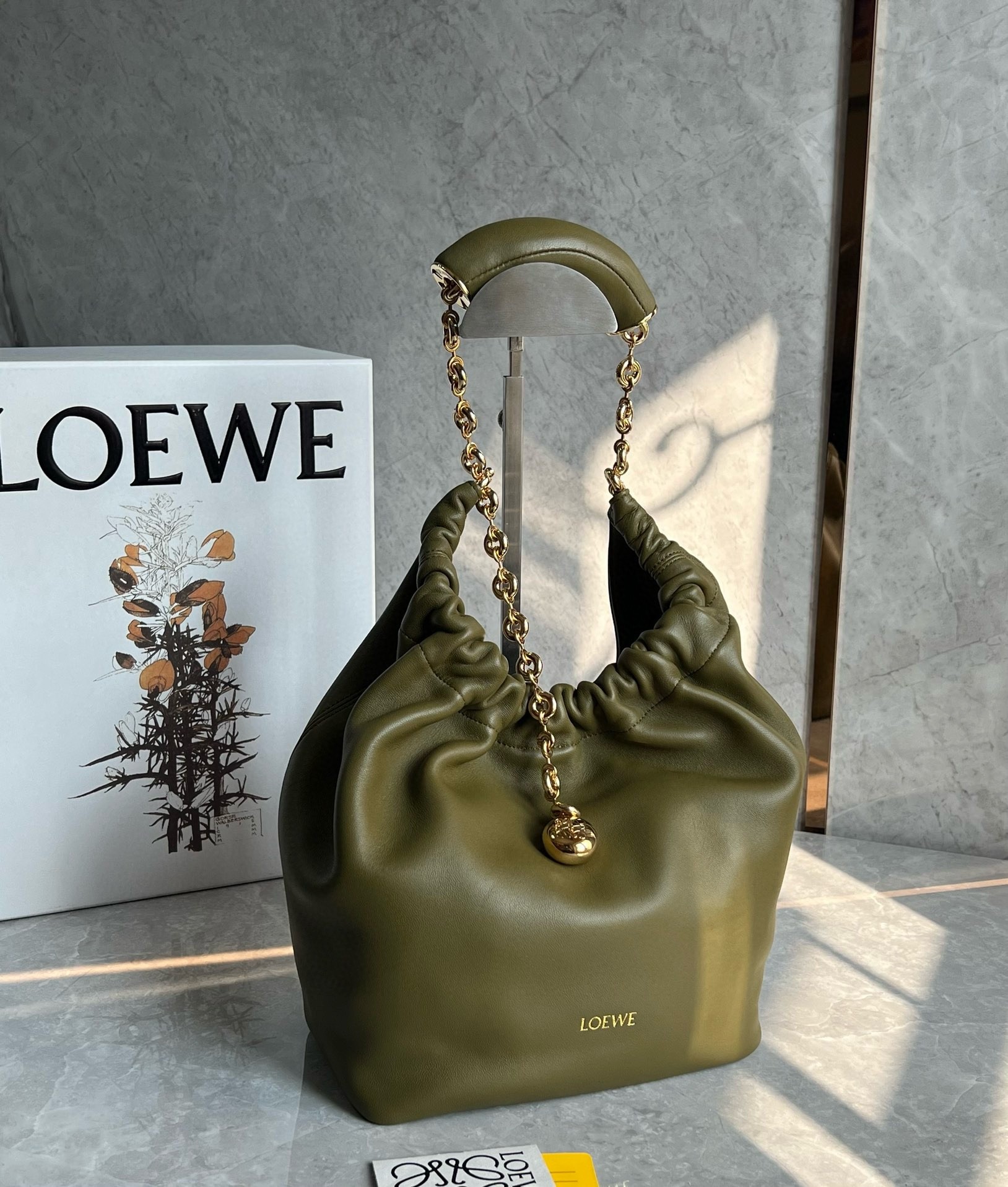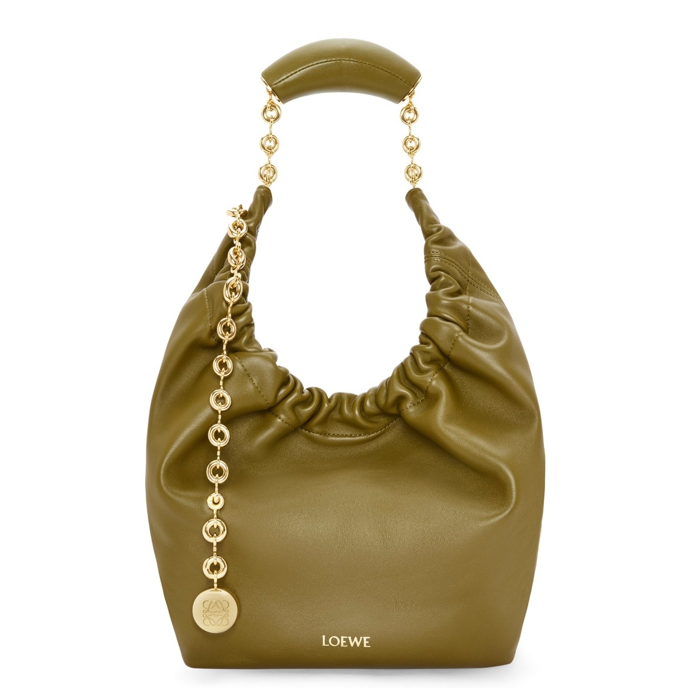 For the Autumn/Winter 2023 collection, LOEWE introduces the new Squeeze silhouette, so named because of its characteristic squishy handle, combines artistic design with fine craftsmanship. Crafted from nappa lambskin and gathered along a doughnut-shaped handle for a design that looks squishy and malleable to touch. A swinging ball chain creates glamorous dynamism, with a puffy leather-coated handle for comfort.