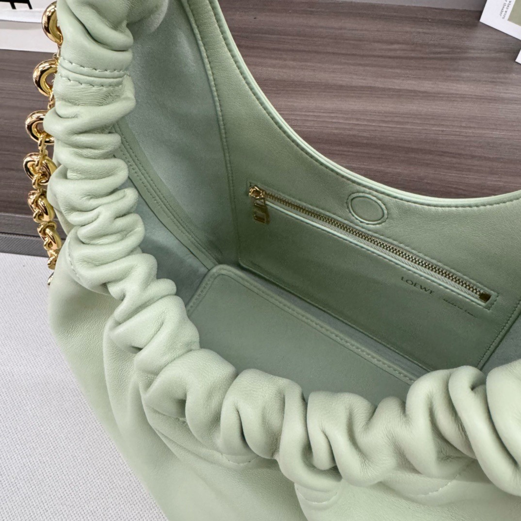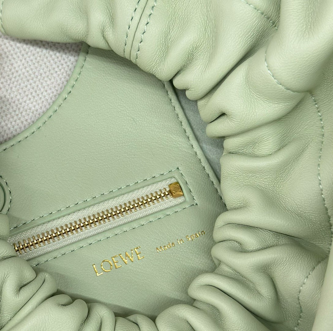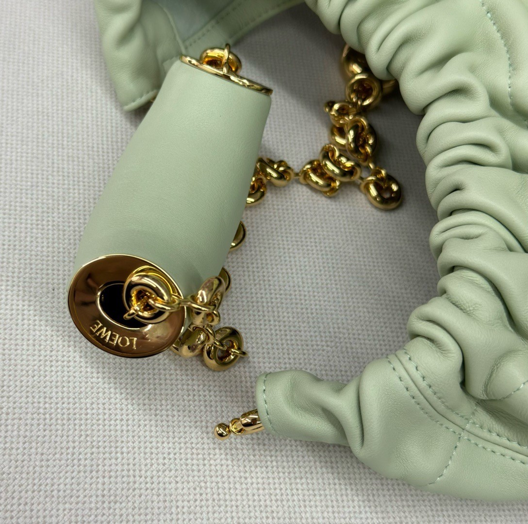 For the Autumn/Winter 2023 collection, LOEWE introduces the new Squeeze silhouette, so named because of its characteristic squishy handle, combines artistic design with fine craftsmanship. Crafted from nappa lambskin and gathered along a doughnut-shaped handle for a design that looks squishy and malleable to touch. A swinging ball chain creates glamorous dynamism, with a puffy leather-coated handle for comfort.