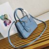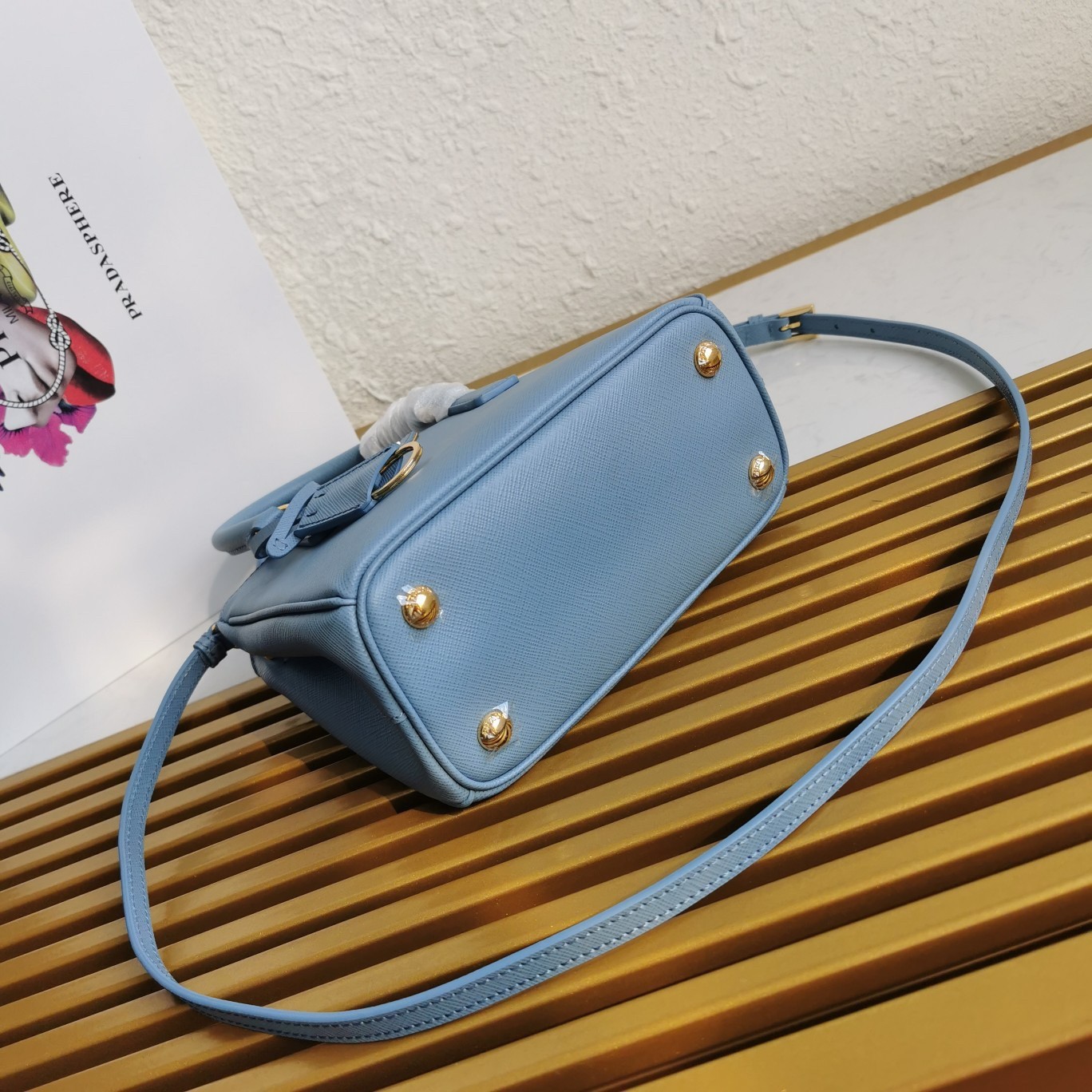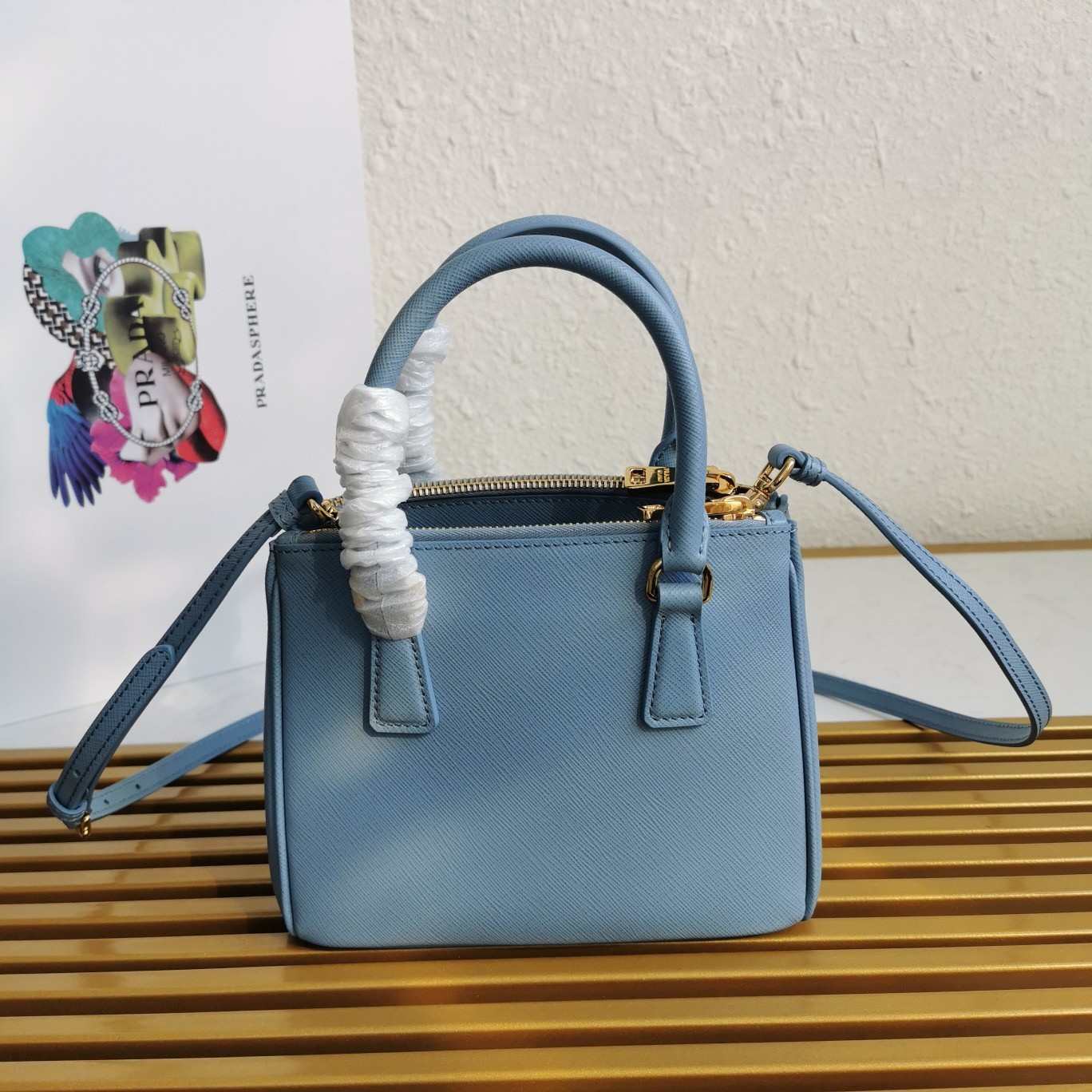 Production of the Prada Galleria bag, composed of 83 pieces, is an authentic fusion between industrial precision and the refined accuracy of craftsmanship that can only be performed by hand. The design is clean and elegant yet innately pragmatic, an aesthetic language blending form and function that combines history and modernity. Originating the definition of “timeless”, the Galleria bag has become a hallmark of Prada’s identity in the twenty-first century. The accessory, presented in the mini version, is made of iconic Saffiano leather that was patented by the founder of the brand and features a crosshatch texture and waxed finish.
