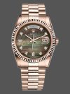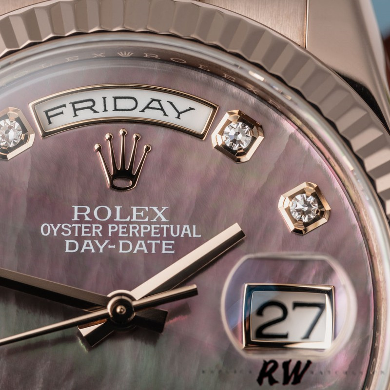Rolex Day-Date 118235 MOP Black Dial 36mm Unisex Replica Watch. 36mm everose gold case with a everose gold president bracelet. Fixed – fluted everose gold bezel. The Tahitian mother of pearl Roman numeral dial.set with 10 diamonds.Date display at 3 o’clock; day display at 12 o’clock. Scratch resistant sapphire crystal. Screw down crown. Solid case back.