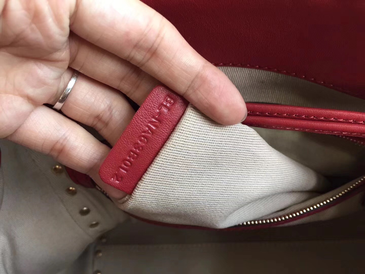 – Platinum-finish studs and metal hardware